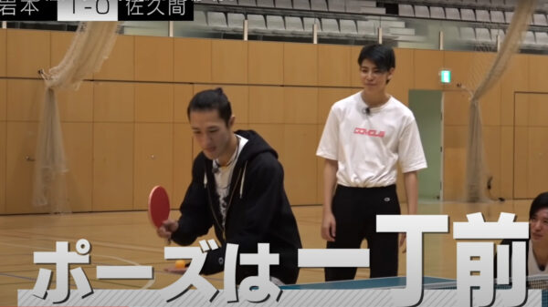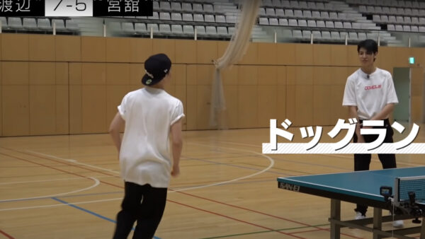 上の渡辺さんのドッグランを同じ動画(異種ラケット卓球)では岩本さんにもガヤを入れていました。