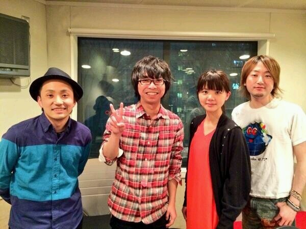 wacci橋口洋平さんは真ん中で、赤いチェックのシャツ着用で、ピースサインしています。