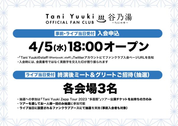 Tani Yuukiさんは過去に、『Tani Yuuki Zepp Tour 2023 “多面態”』開催、そしてオフィシャルファンクラブ『谷乃湯 〜たにのゆ〜』開設を記念して、ツアー会場での「終演後ミート&グリートご招待キャンペーン」をファンクラブ限定で開催していました。