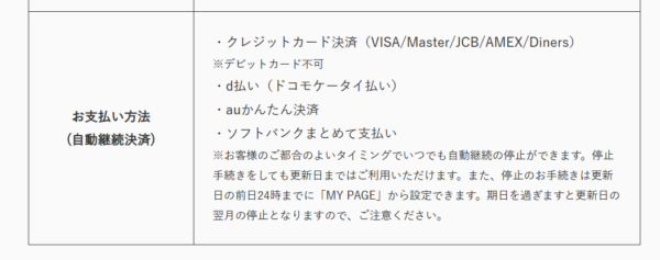 また、更新日に関する情報は特に記載されていませんでしたが、支払方法がいくつかあることから、支払方法ごとに更新日が異なる可能性もありますね。それぞれの利用決済方法別に、何日が更新日なのかそれぞれ把握しておくと、無駄なお金を支払わずに済むかもしれませんね。また、「更新日の前日の24時までに」とあるのでその点は注意してください。