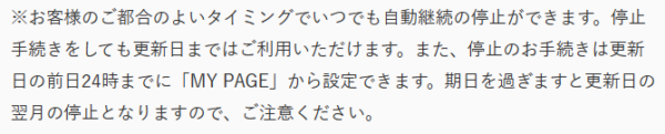 「お客様のご都合のよいタイミングでいつでも自動継続の停止ができます。停止手続きをしても更新日まではご利用いただけます。また、停止のお手続きは更新日の前日24時までに「MY PAGE」から設定できます。期日を過ぎますと更新日の翌月の停止となりますので、ご注意ください。」