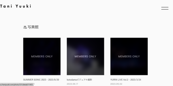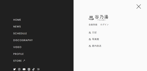 Tani Yuukiさんの公式ホームページの右上にある横二本線を押すと、上半分は黒背景にHOMEやNEWSなどが表示され、下半分は白背景に谷乃湯と表示されるので、(スマートフォン表示の場合。PCの場合は右上の二本線をタップすると、左側が黒、右側が白という画面表示になります)谷乃湯の会員登録という項目から登録することが出来ます!