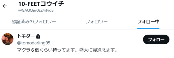 フォロワーは2100人ちょっと。登録した時期は2016年で最終ツイートが2018年の11月ですから、結構長い間更新されていないということになります。また唯一のフォロー1人はトモダーという人物でした。